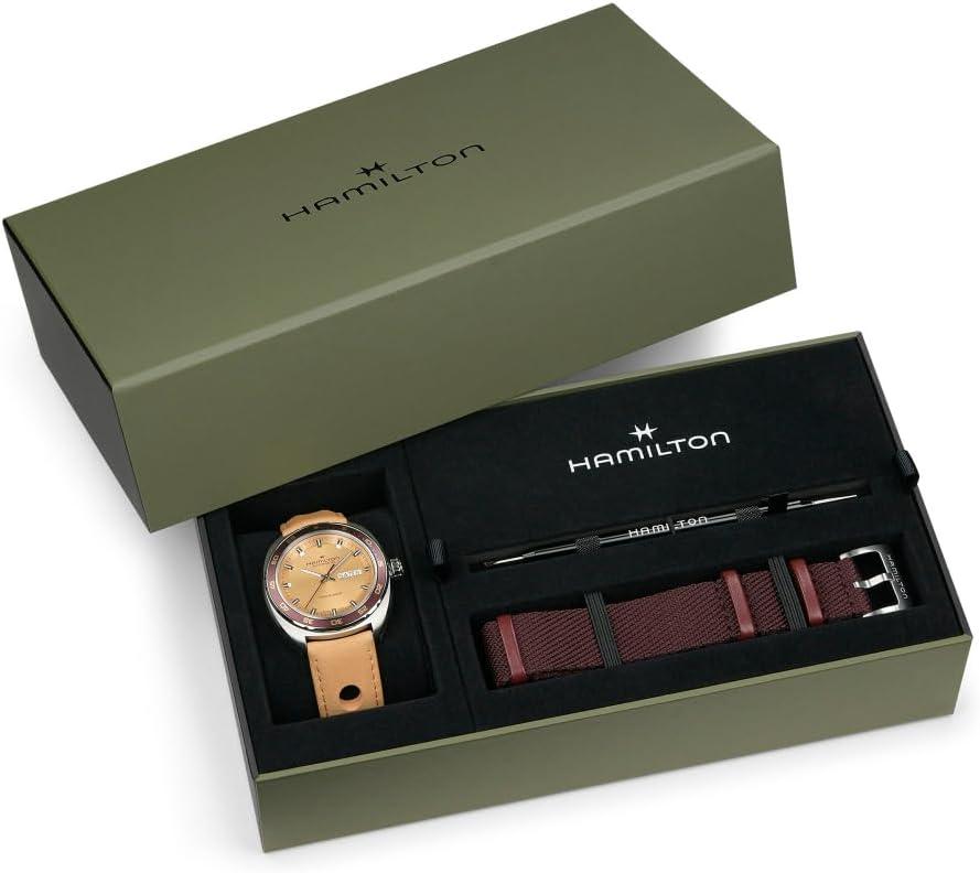 Hamilton American Classic Automatic Men’s Watch, 42mm Stainless Steel Case, Swiss Made, Beige Dial Analog Wrist Watch for Men, 50m Waterproof, Sapphire Crystal, 3-Hand Movement, Cow Leather Strap
