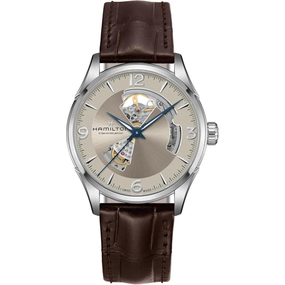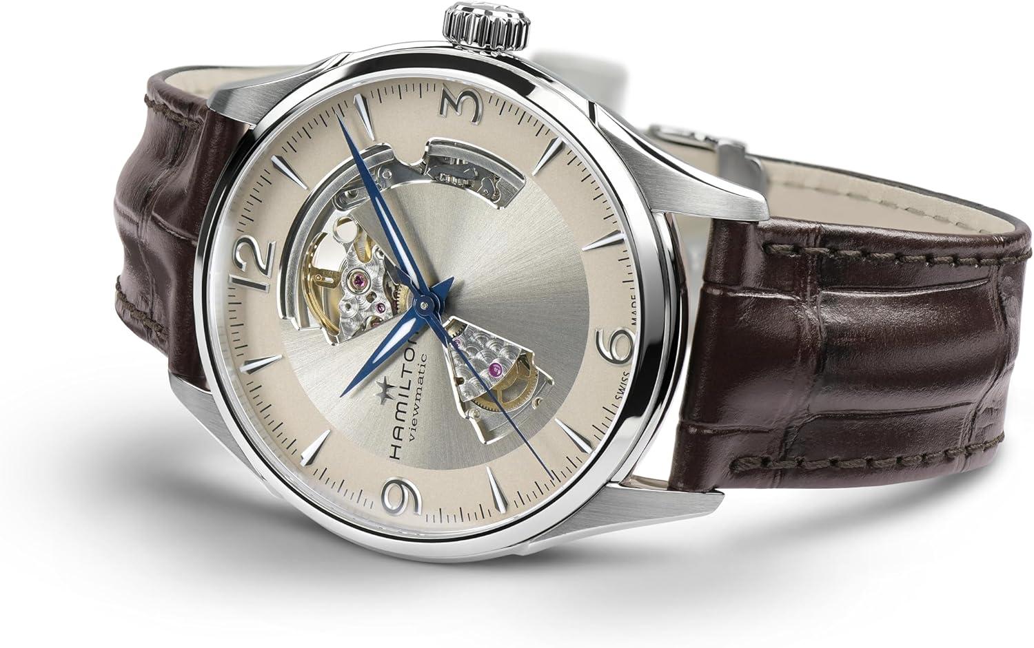 Hamilton Jazzmaster Open Heart Automatic Men’s Watch, 42mm Stainless Steel Case, Swiss Made, Beige Dial Analog Wrist Watch, 50m Waterproof, Sapphire Crystal, 3-Hand Movement, Cow Leather Strap