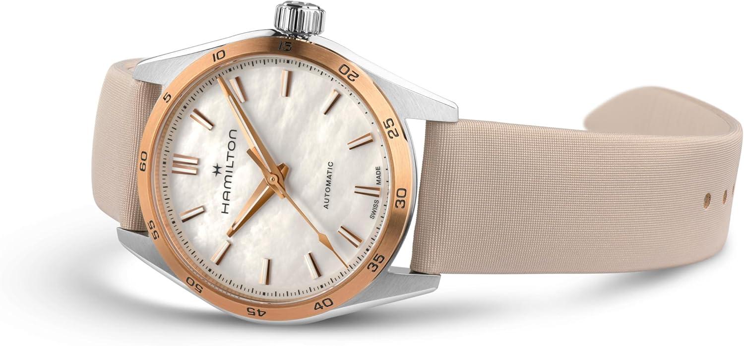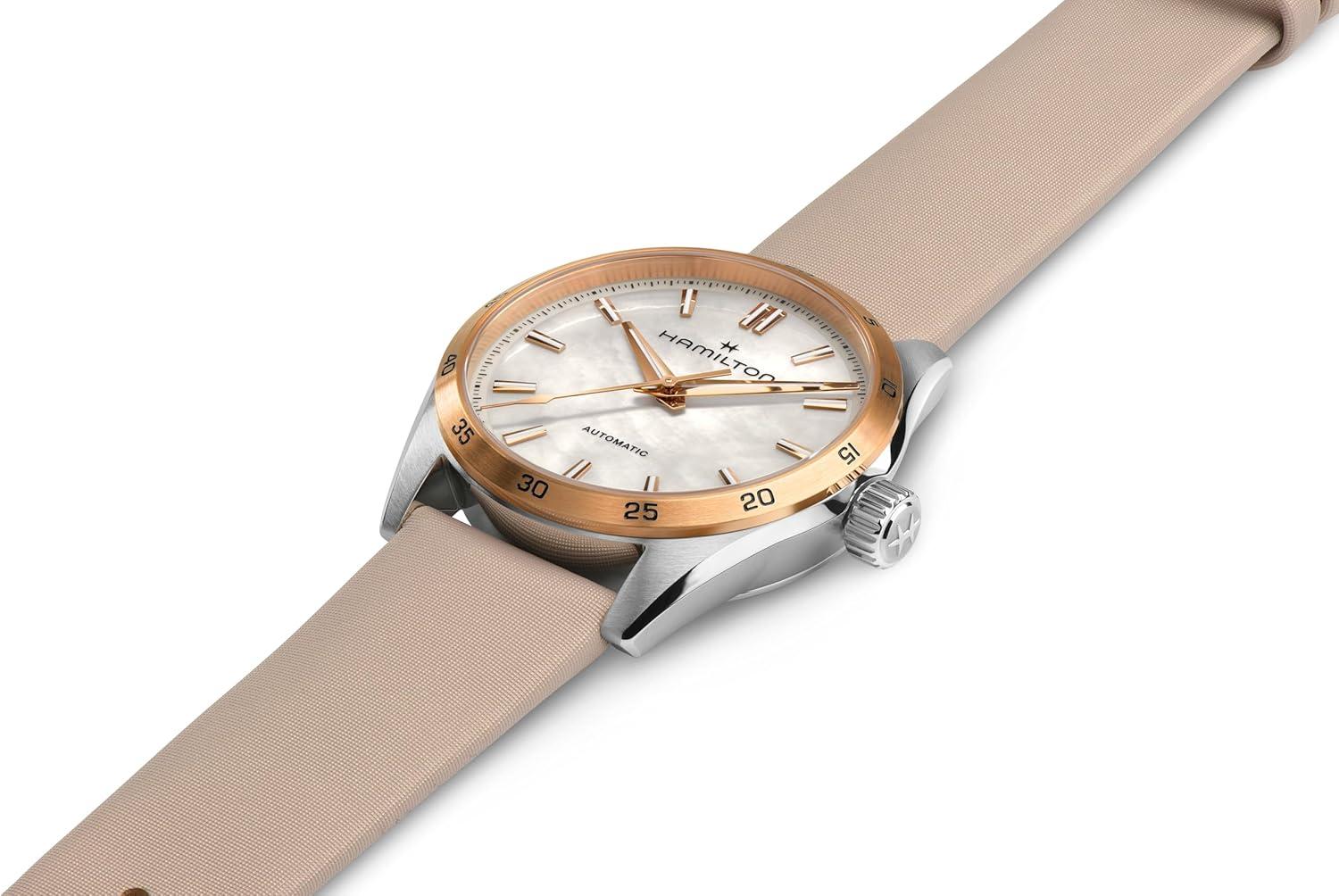 Made for those who favor function and style at once, the Jazzmaster Performer line offers a powerful sport-chic appearance. Powered by the H-10 automatic movement with 80 hours power reserve, this Jazzmaster Performer Automatic features a 34mm stainless steel case with a rose gold PVD coated bezel accented by an iridescent mother-of-pearl dial and a beige satin strap.