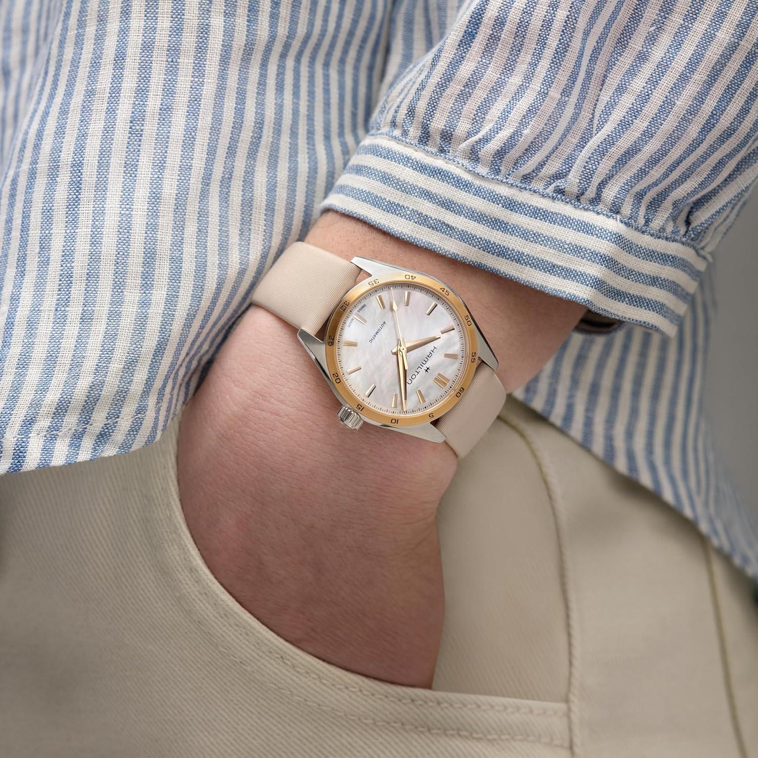 Hamilton Jazzmaster Performer Automatic Men’s Watch, 34mm Stainless Steel Case, Swiss Made, Mother of Pearl Dial Analog Wrist Watch, 100m Waterproof, Sapphire Crystal, 3-Hand Movement, Satin Strap