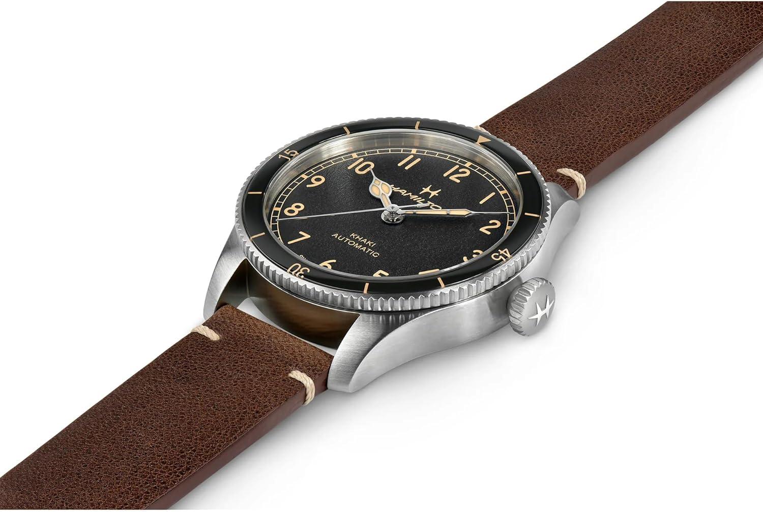 Hamilton Khaki Aviation Automatic Men’s Watch, 38mm Stainless Steel Case, Swiss Made, Black Dial Analog Wrist Watch for Men, 100m Waterproof, Sapphire Crystal, 3-Hand Movement, Cow Leather Strap