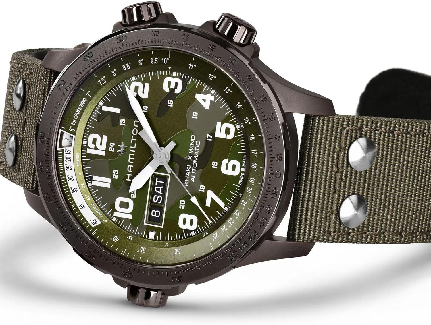 Designed with pilots in mind and built for a life of adventure, the Khaki Aviation X-Wind Day Date Automatic flies through crosswinds with a new camouflage patterned dial paired with a brown PVD-coated case and green textile strap. Featuring an inner rotating bezel and a day-date window at 9 o'clock, this high-performance piece has combat-chic style.