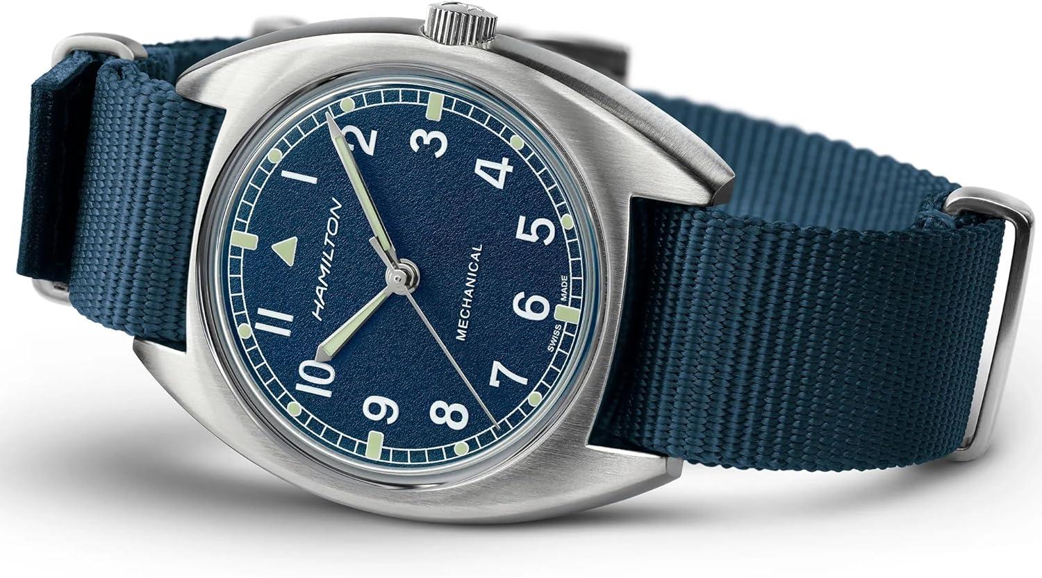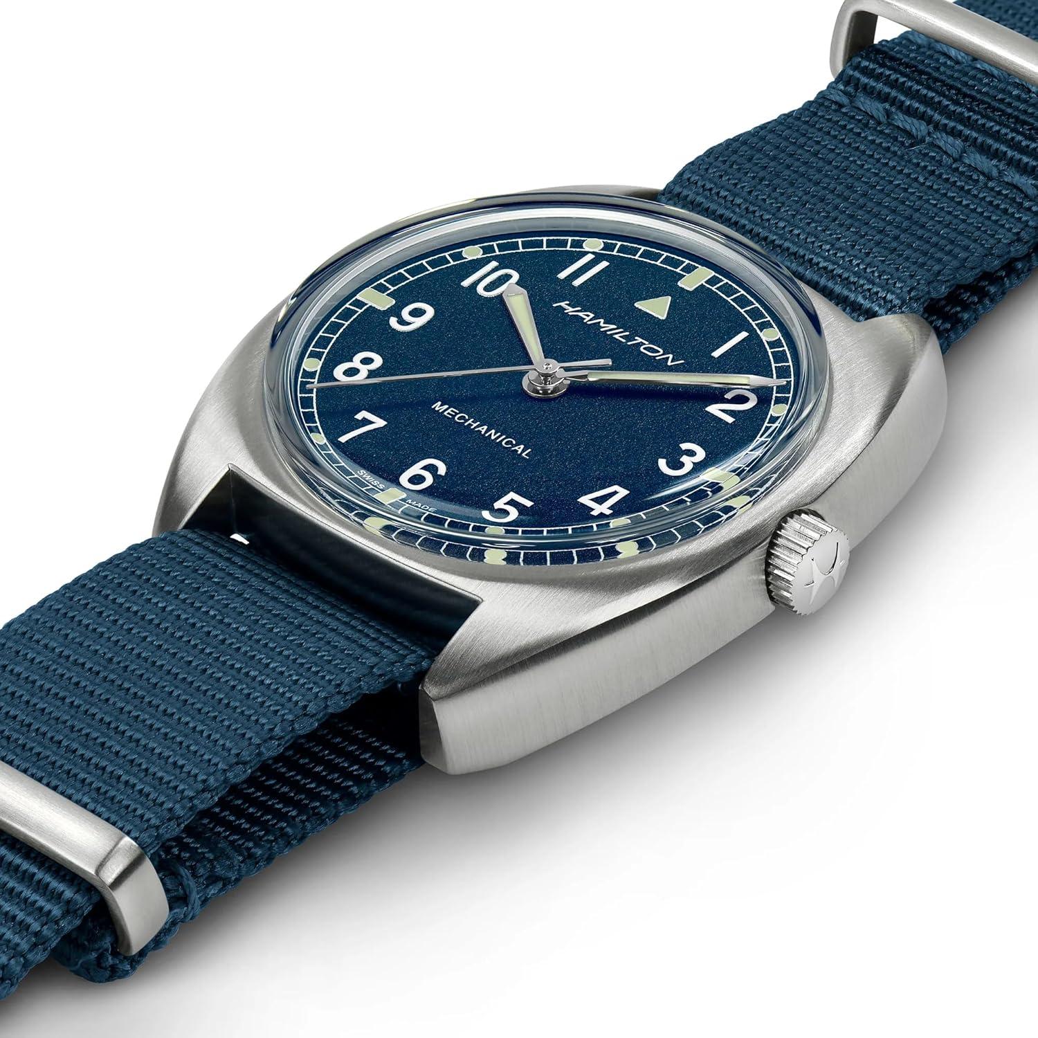 Hamilton Khaki Aviation Pilot Mechanical Men’s Watch, 36mm x 33mm Stainless Steel Case, Swiss Made, Blue Dial Analog Wrist Watch for Men, 100m Waterproof, Mineral Crystal, Textile Strap