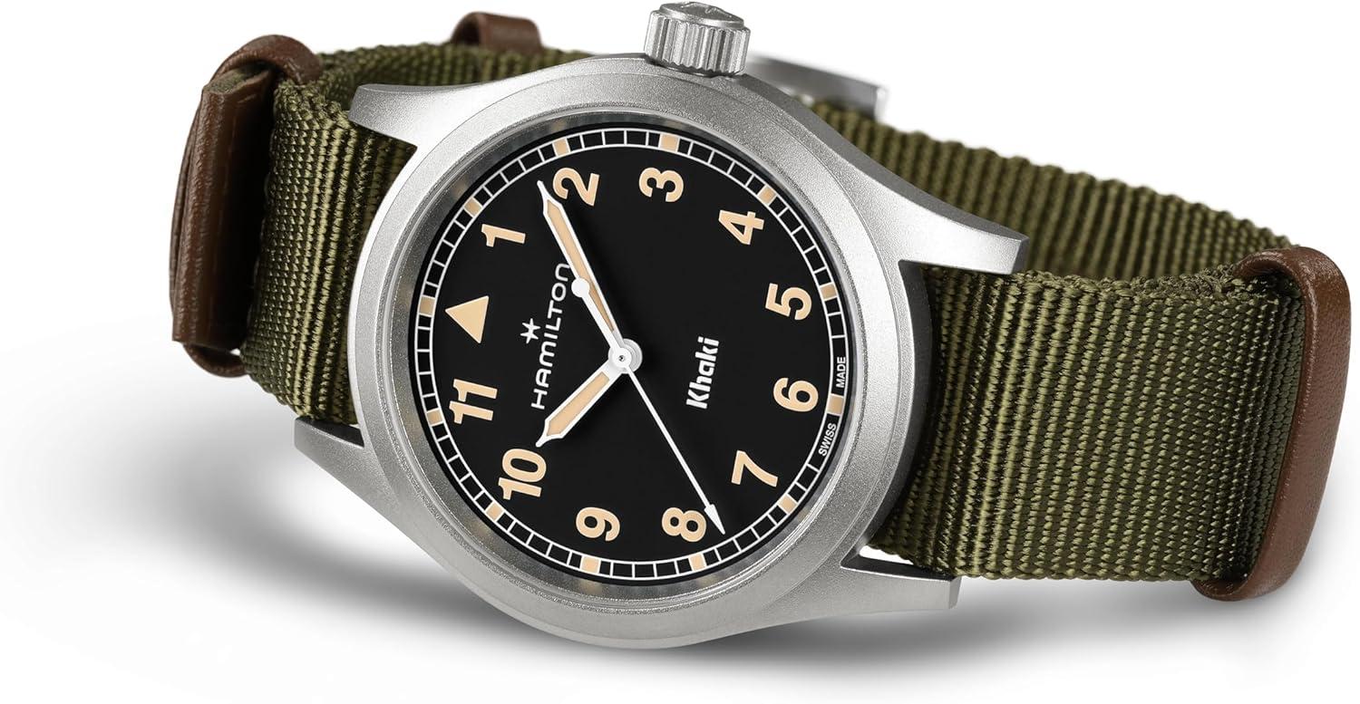 Hamilton Khaki Field Khaki Quartz Men’s Watch, 38mm Stainless Steel Case, Swiss Made, Black Dial Analog Wrist Watch for Men, 50m Waterproof, Sapphire Crystal, Textile Strap