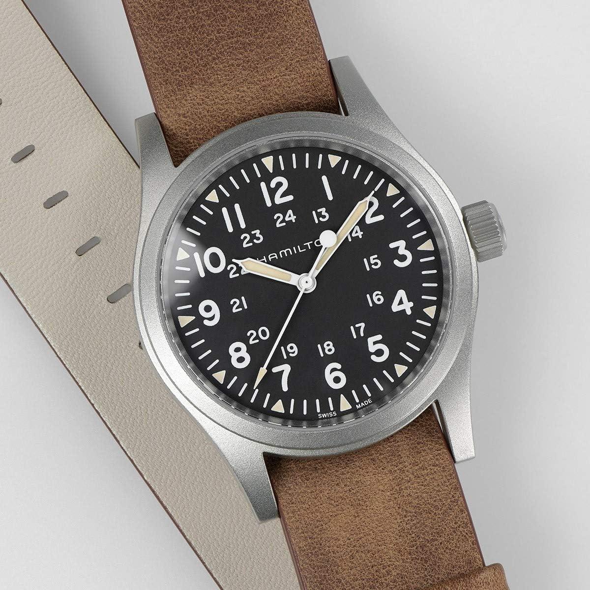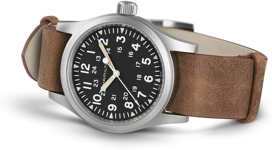 Hamilton Khaki Field Mechanical Men’s Watch, 38mm Stainless Steel Case, Swiss Made, Black Dial Analog Wrist Watch for Men, 50m Waterproof, Sapphire Crystal, Cow Leather Strap
