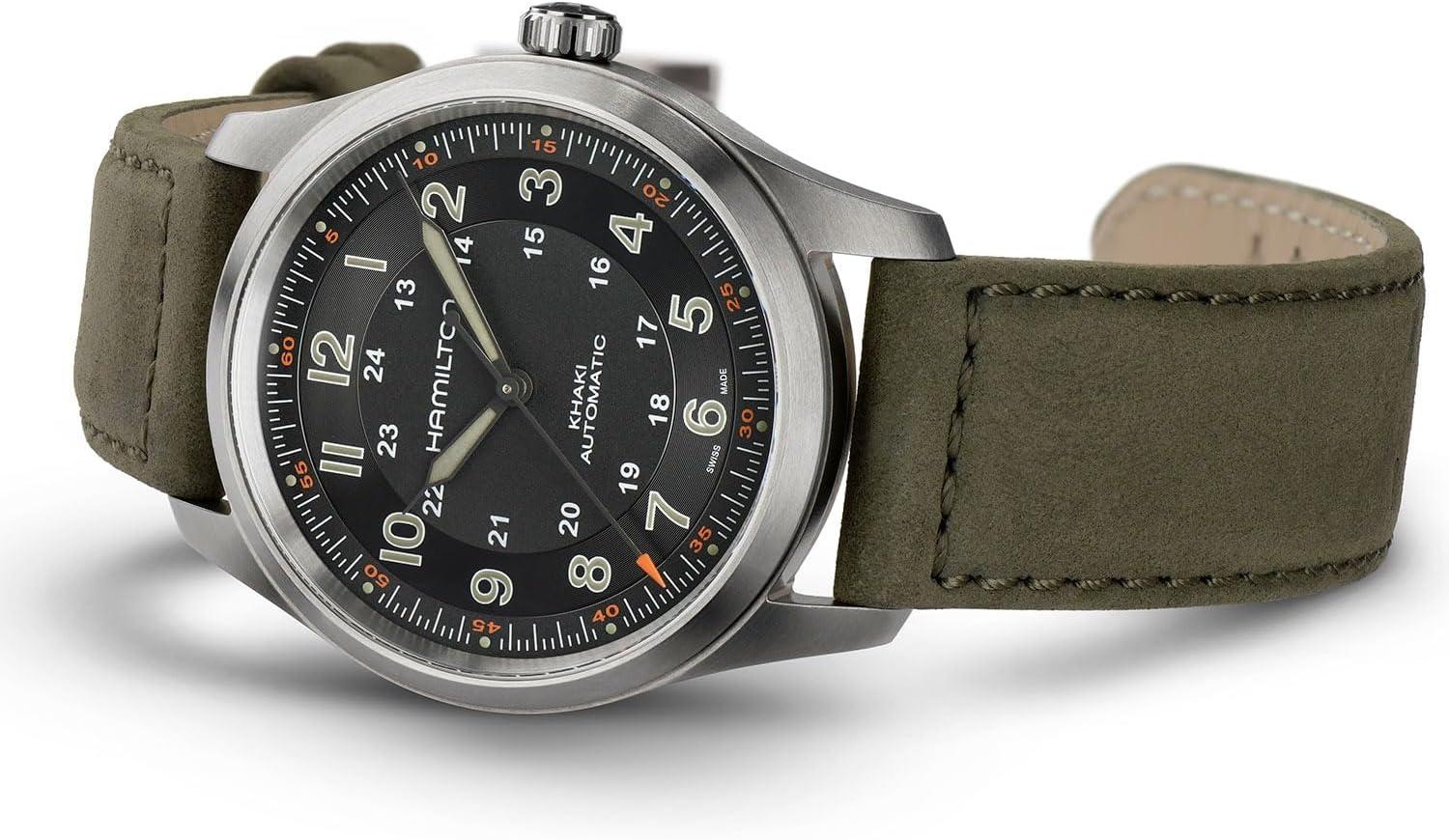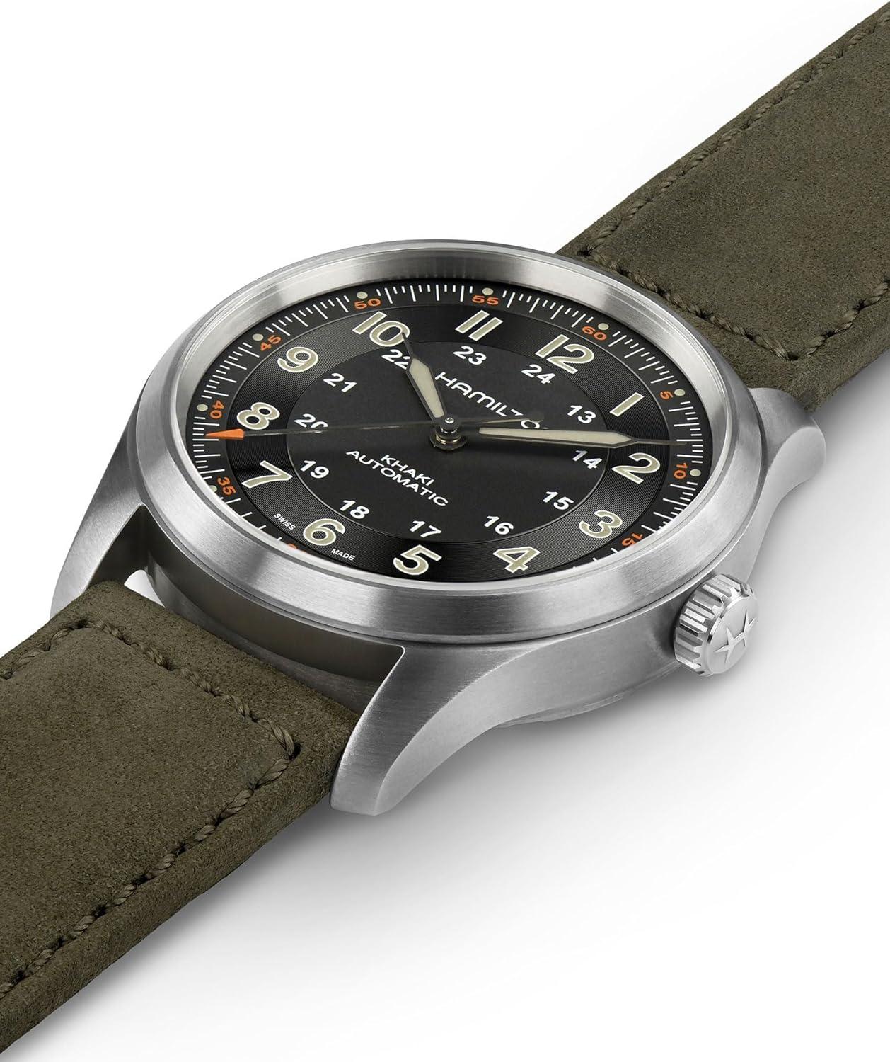 Hamilton Khaki Field Titanium Automatic Men’s Watch, 38mm Titanium Case, Swiss Made, Black Dial Analog Wrist Watch for Men, 100m Waterproof, Sapphire Crystal, 3-Hand Movement, Cow Leather Strap